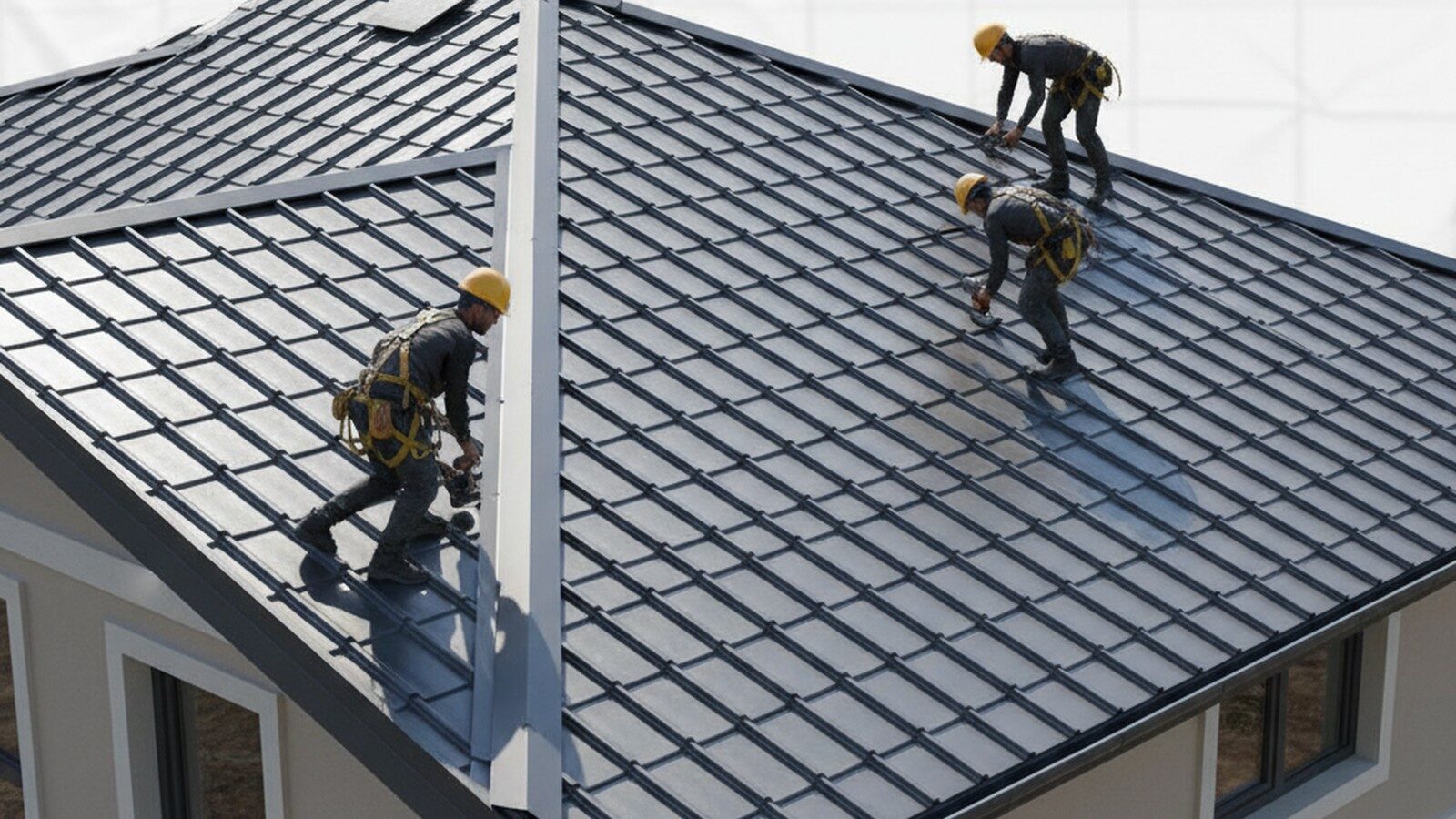 Что входит: проверка стропильной системы, монтаж гидро- и пароизоляционных слоев, установка обрешетки, укладка листов, монтаж доборных элементов, обработка карнизов и коньков, герметизация проходок.